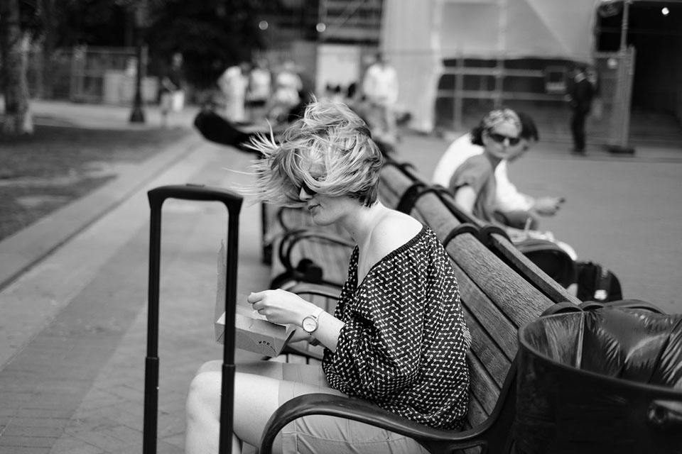 A woman enjoys (well, I don't know, maybe) some wind with her lunch.
