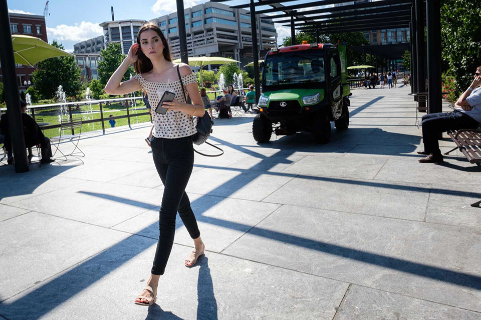 A woman casually flees from a small truck.