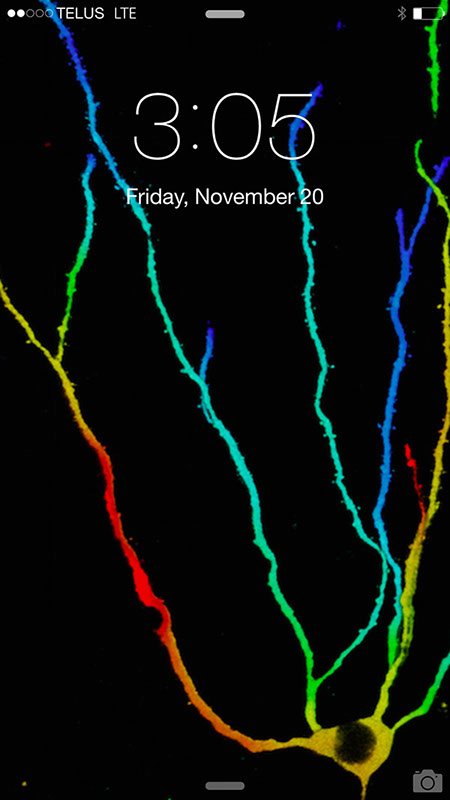 A GFP-labelled neuron generated in my lab and color coded according to the depth of the neuron within the tissue.
