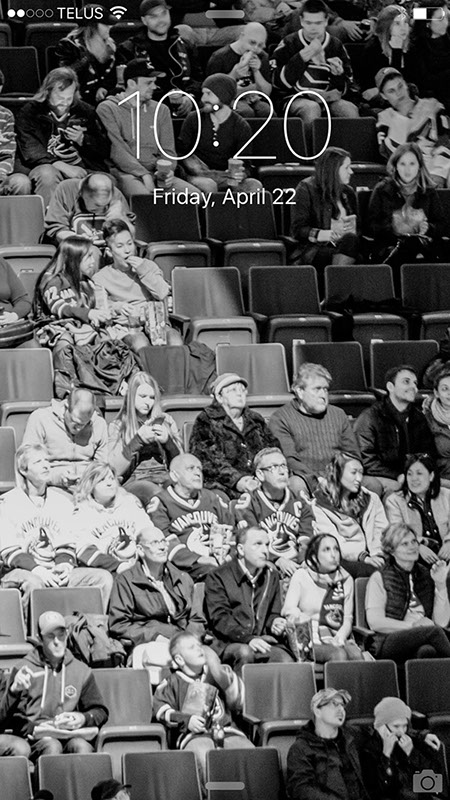 Fans at a Canucks NHL game; light sweeping across the crowd.