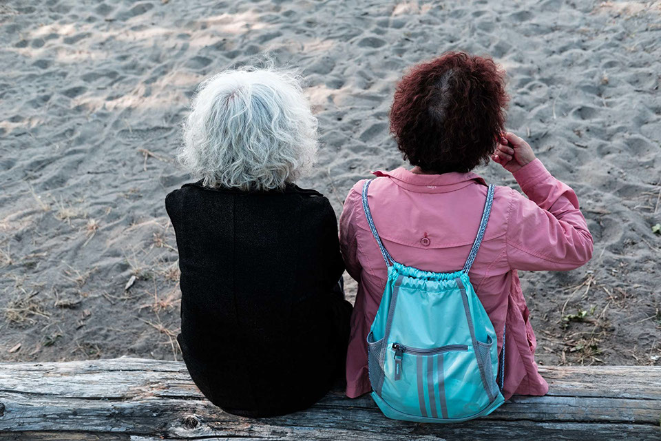 Two ladies with great hair enjoy some treats and a view.